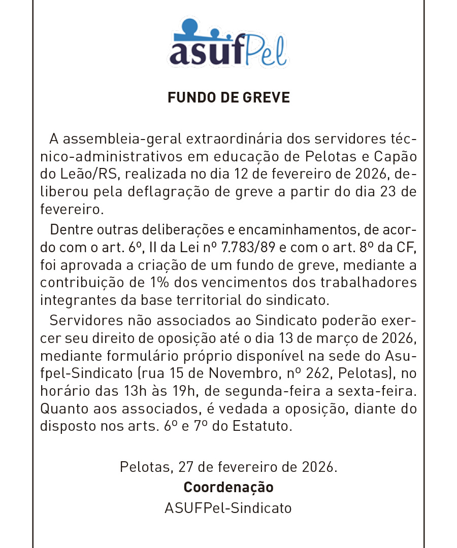 A assembleia-geral extraordinária dos servidores técnico-administrativos em educação de Pelotas e Capão do Leão/RS, realizada no dia 12 de fevereiro de 2026, deliberou pela deflagração de greve a partir do dia 23 de fevereiro.