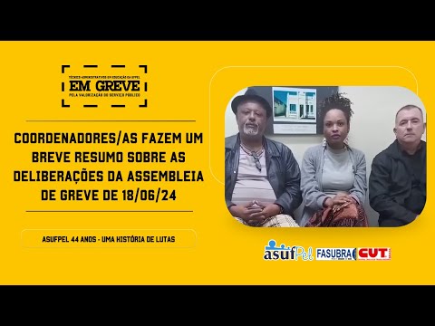 Neste vídeo a Coordenação do ASUFPEL-SINDICATO, Sidnei Tarouco, Mara Beatriz Gomes e Antonio Azambuja, faz um breve resumo sobre as deliberações da assembleia de greve do dia 18/06/24. Nela, a base da entidade deliberou por aceitar a última proposta do Governo, que traz ga...